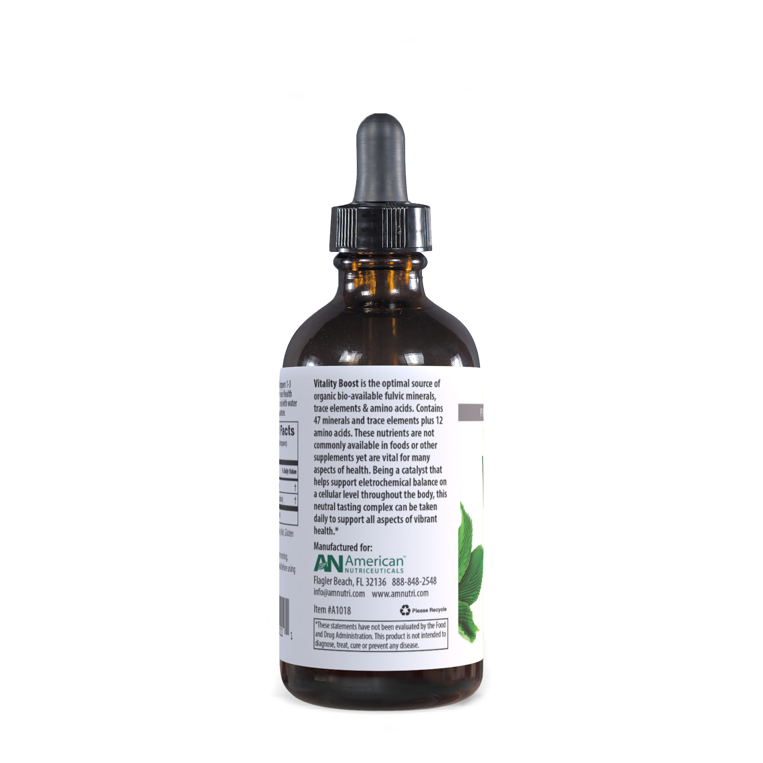 Vitality Boost offers a rich source of bio-available fulvic minerals, trace elements and amino acids derived from naturally occurring freshwater humic shale (ancient plant matter) mined in the U.S. It is completely organic and naturally occurring.